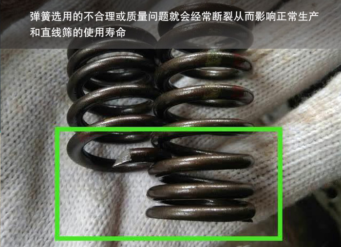 如果在篩分分級過程中反復(fù)停啟篩機(jī),勢必會造成彈簧在短時間內(nèi)反復(fù)承受高強度的振篩力,長期的這種頻繁重載起停篩機(jī)是導(dǎo)致彈簧斷損的一個主要原因。