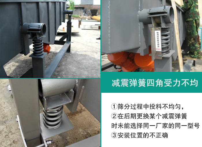 導(dǎo)致振動篩彈簧受力不均的原因很多,篩分過程中投料不均勻,造成一側(cè)的物料出現(xiàn)厚層堆積現(xiàn)象就是最常見的原因;此外,在后期更換某個減震彈簧時未能選擇同一廠家的同一型號,導(dǎo)致新舊振動篩彈簧彈力系數(shù)不一致,也是造成減震彈簧四角受力不均的重要原因;安裝位置的不正確也會造成振動篩選機(jī)出現(xiàn)振動篩彈簧四角振動頻率不均的情況。
